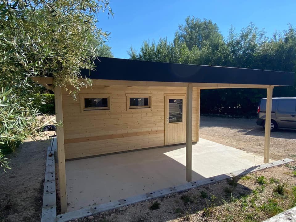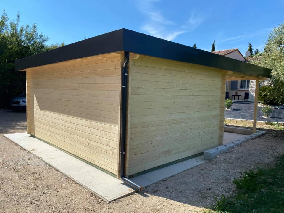 Pose garage Drome 18m² intérieur + 17m² extérieur avec porte sectionnelle motorisée (en option), habillage métallique (en option) et revêtement de toiture EPDM à Les Casses 11