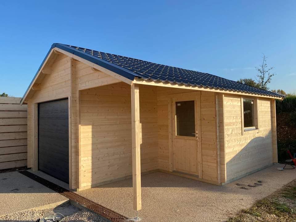 Garage Gap de 22m² avec sa porte sectionnelle motorisée gris anthracite (existe aussi en blanc et porte battante en bois massif) avec toiture en tuiles acier en gris anthracite en option